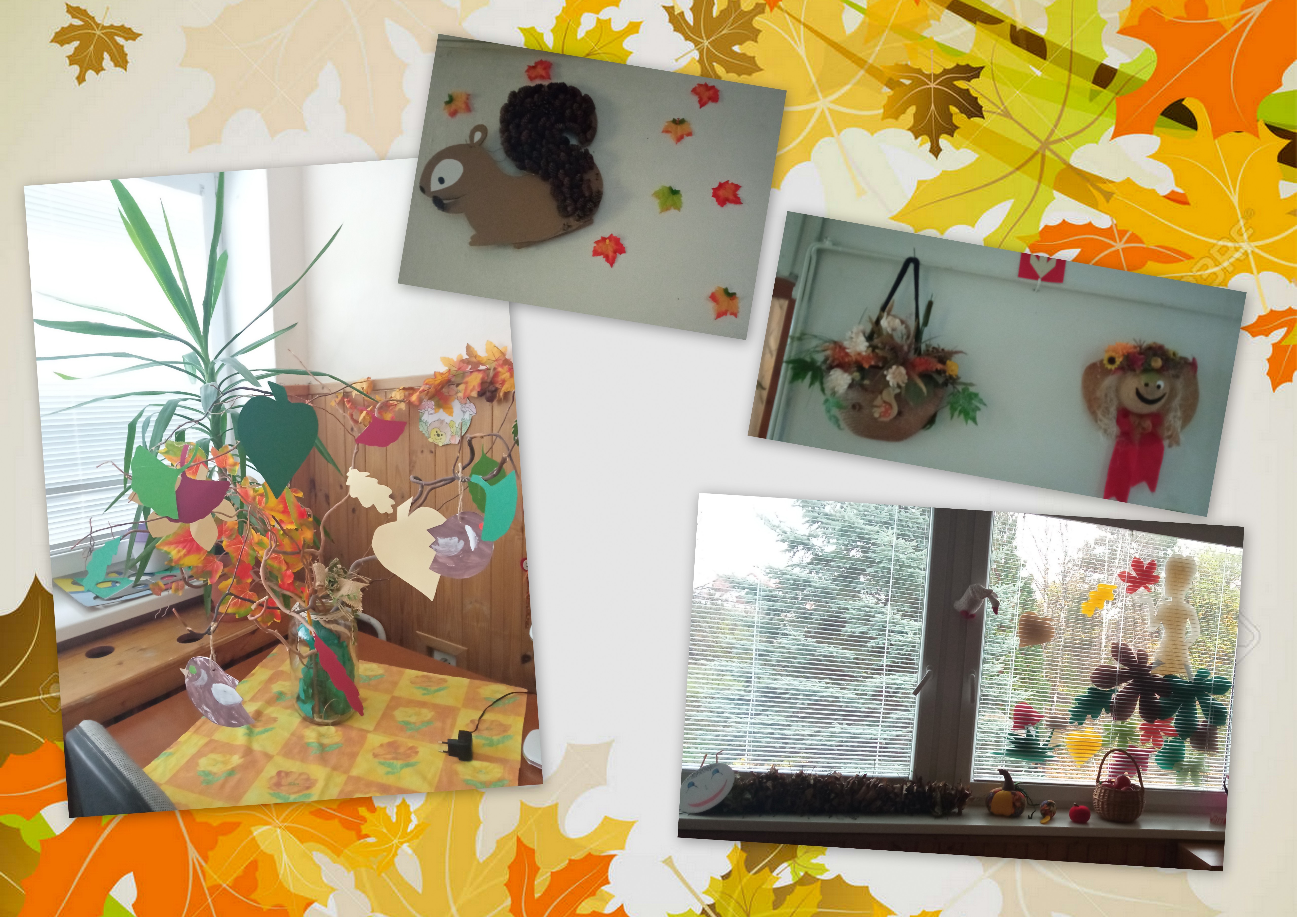 Jeseň pani bohatá, farbí listy do zlata.....Veru aj u nás sú už sfarbené, aj opadané. :-) Naši mladí sa s nimi trochu popasujú na chodníku, aby bolo čisto. Na stromoch zostalo posledné ovocie, ktoré zozbierame na spracovanie. Aj oddelenia sme už vyzdobili jeseňou... a pred budovou k nám zavítal Laco s jesennou parádou a spríjemňuje nám príchody a odchody. :-) Síce nerozpráva, ale vždy nás svojou prítomnosťou poteší :-)