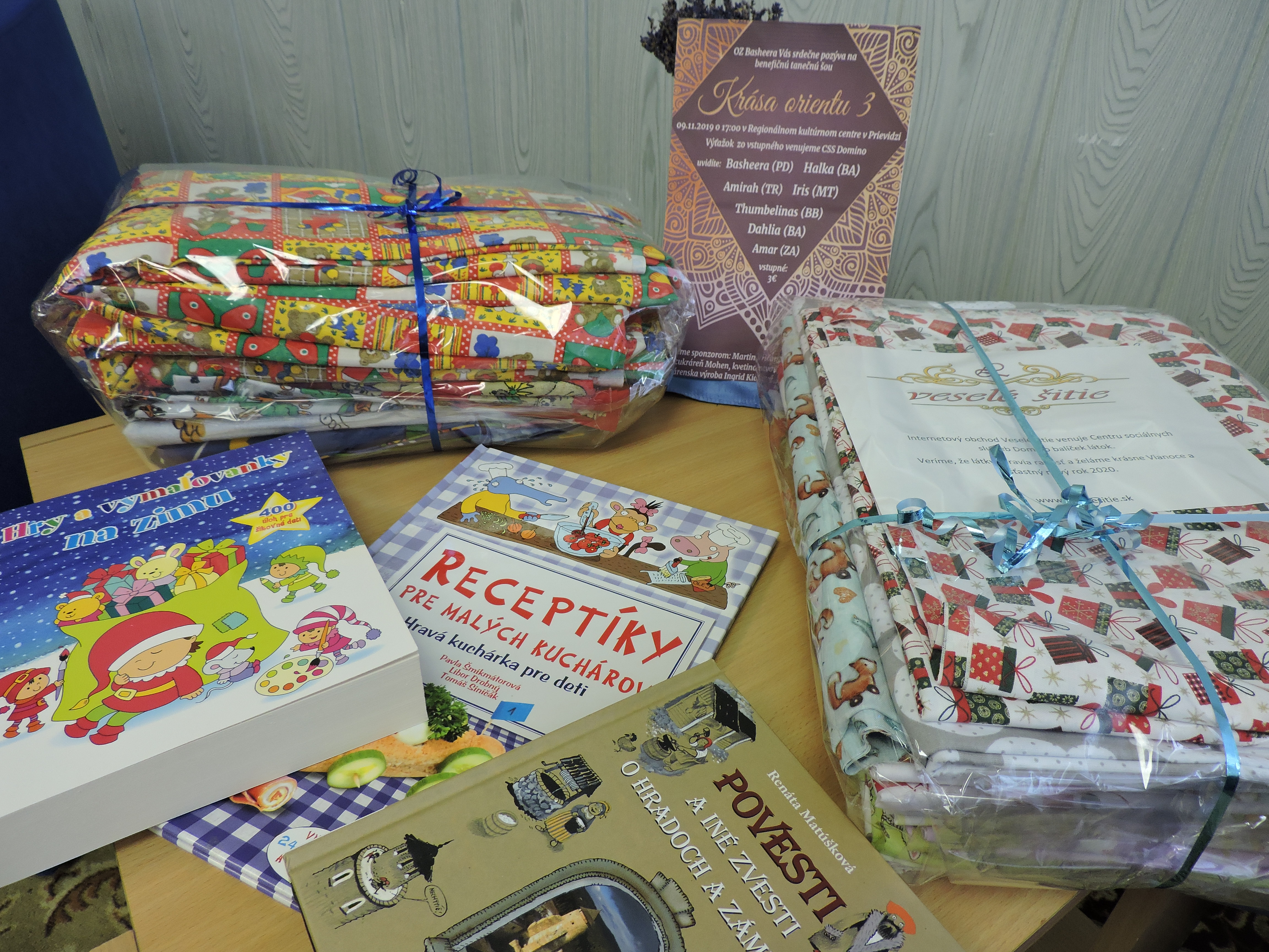 9.11.219 sa v Regionálnom kultúrnom centre v Prievidzi konala benefičná tanečná šou s názvom Krása orientu 3, na ktorú pozývalo OZ Basheera z Prievidze. Na tejto tanečnej šou sa predstavili: Basshera (PD), Halka (BA), Amirah (TR), Iris (MT), Thumbelinas (BB), Dahlia (BA), Amar (ZA). Výťažok zo vstupného vo výške 130,-€ bol venovaný nášmu zariadeniu CSS-DOMINO za čo všetkým zo srdca ďakujeme. Darček v podobe kníh a balíčkov látok , ktoré venovalo Veselé šitie a tiež výťažku z podujatia si prevzala p. riaditeľka, ktorá sa podujatia zúčastnila aj s niekoľkými klientkami z nášho zariadenia. Názov Basheera v preklade znamená „posol dobrých správ“ a je to príznačné, pretože to pre nás bola naozaj dobrá správa, keď sme sa o tomto podujatí dozvedeli. Ešte raz srdečne ďakujeme členkám OZ Basheera aj všetkým účastníkom podujatia a návštevníkom za výťažok, ktorý nám venovali a prajeme im do ďalších dní veľa úspechov a stáleho elánu, aby svojím tancom naďalej rozdávali radosť.:-)